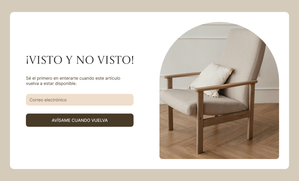 Un formulario en páginas de productos agotados convierte una venta perdida en una lista de clientes preparados para comprar cuando haya stock.